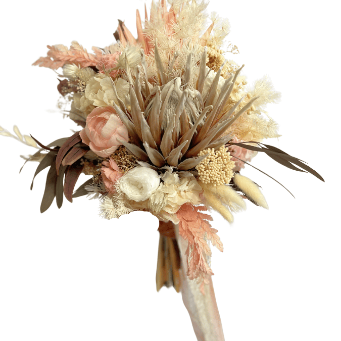 Elegant and natural Maids bouquets featuring gorgeous pink and cream tones using preserved Roses, Sola blooms, premium preserved ingredients matching the rest of the range.